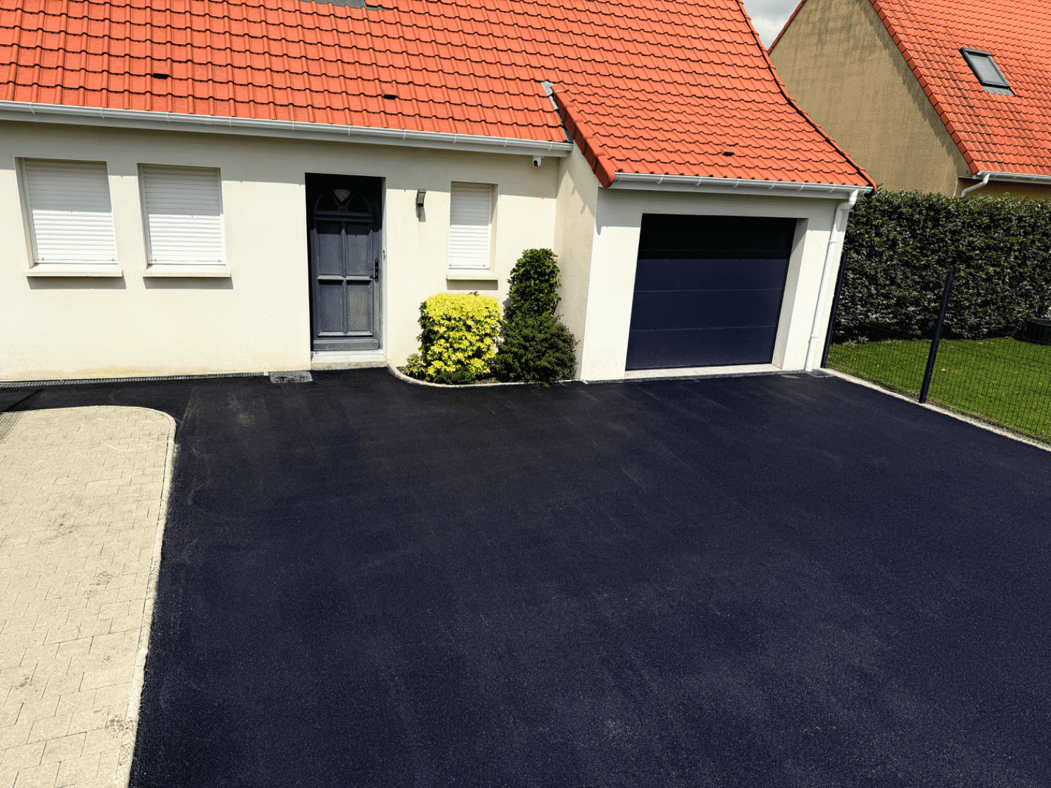 Pour notre équipe de professionnels expérimentés dans les travaux d’aménagement extérieur, l’objectif était clair : moderniser l’accès à la porte du garage autant qu’à la porte d’entrée de la maison, faciliter le passage des véhicules et valoriser la devanture de la propriété avec un revêtement extérieur propre, résistant et dans l’air du temps.