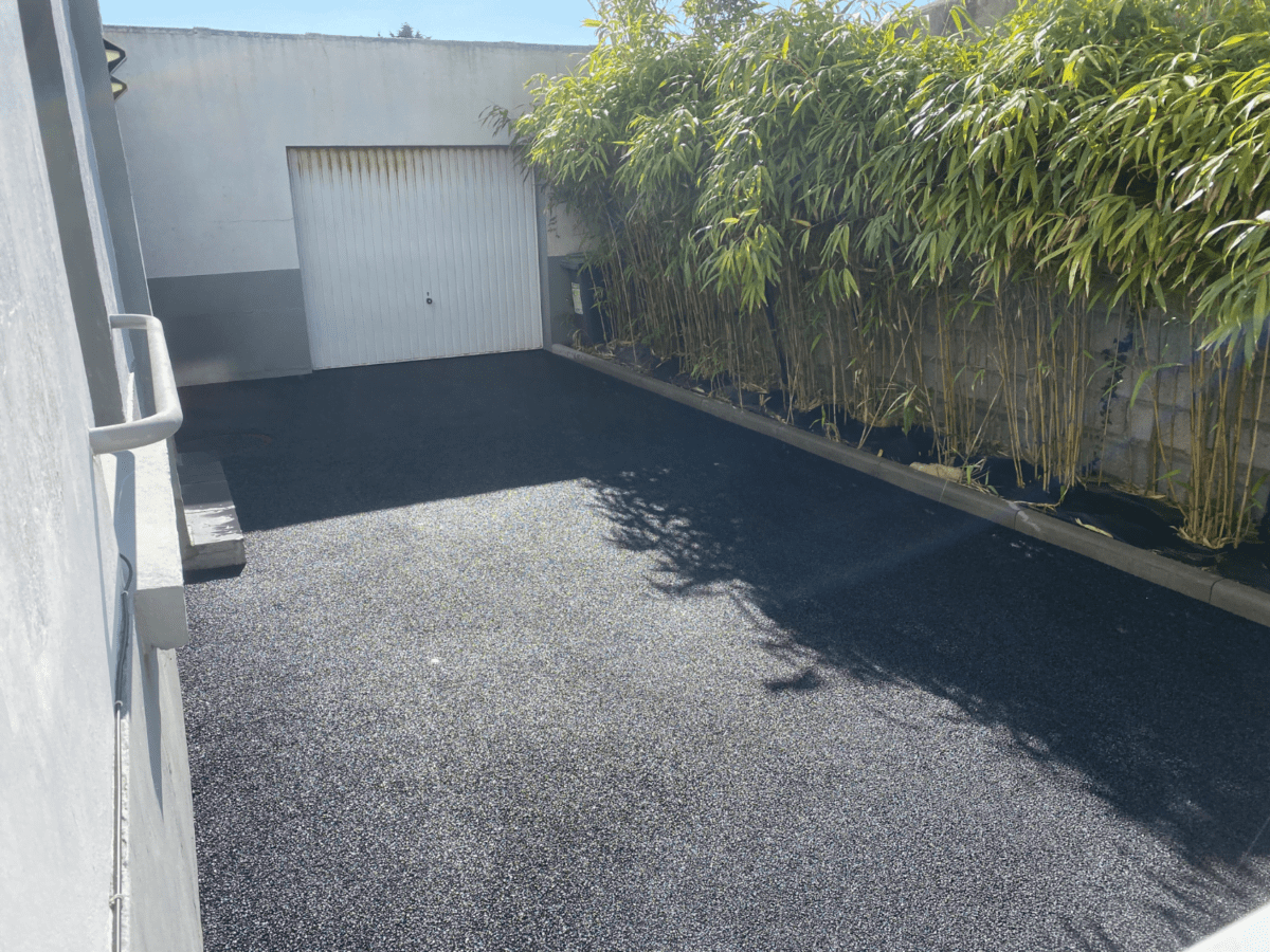 34 m² d’enrobé noir, offrant une surface carrossable, esthétique et sans entretien des mauvaises herbes, idéale pour un usage quotidien devant la porte de garage.