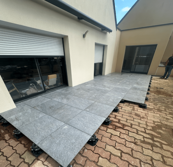 La pose de dalles en grès cérame offre un rendu homogène et moderne. Sa teinte grise apporte une touche élégante et intemporelle qui s’intègre facilement à tous les styles d’habitation.